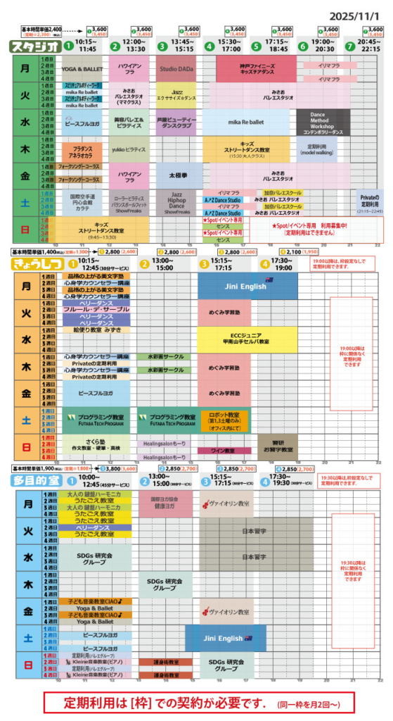 - 空き時間枠は 定期利用のタイムテーブル ご確認ください。