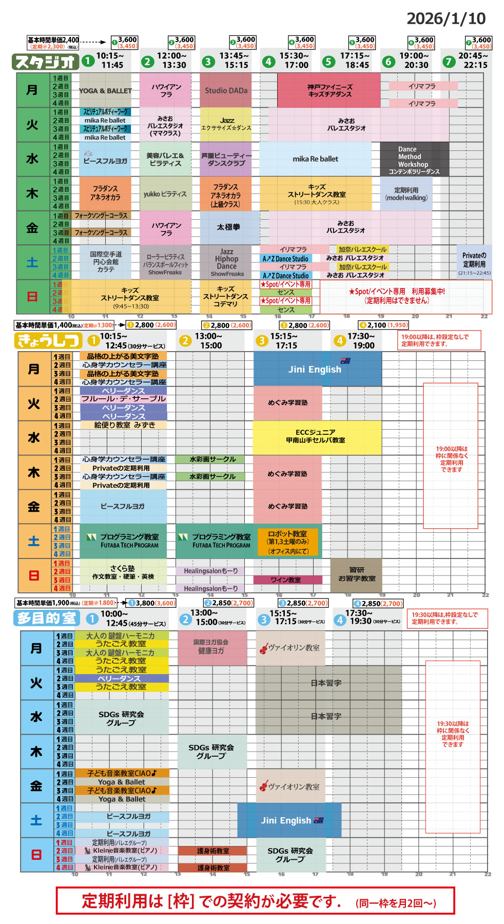ブロックの色( スタジオ 教室 多目的室 )をご覧いただき、予約が入ってない時間で一時利用(スポット利用)が可能です。空いているかどうかお電話は不要。お申込みは お問合せフォーム からどうぞ。