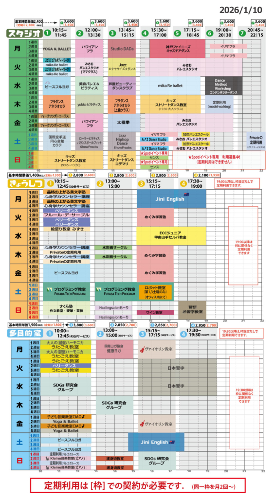 六甲らぼの定期利用をお考えの方は、こちらの表で空き時間の枠をご確認ください。